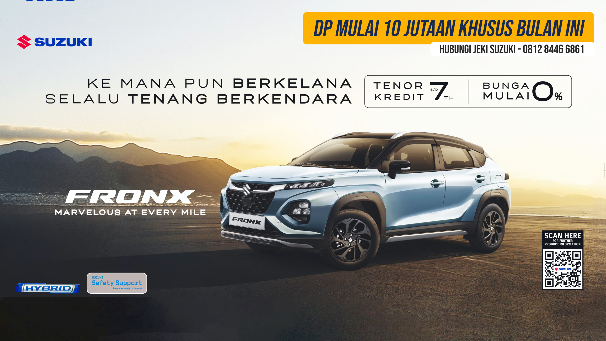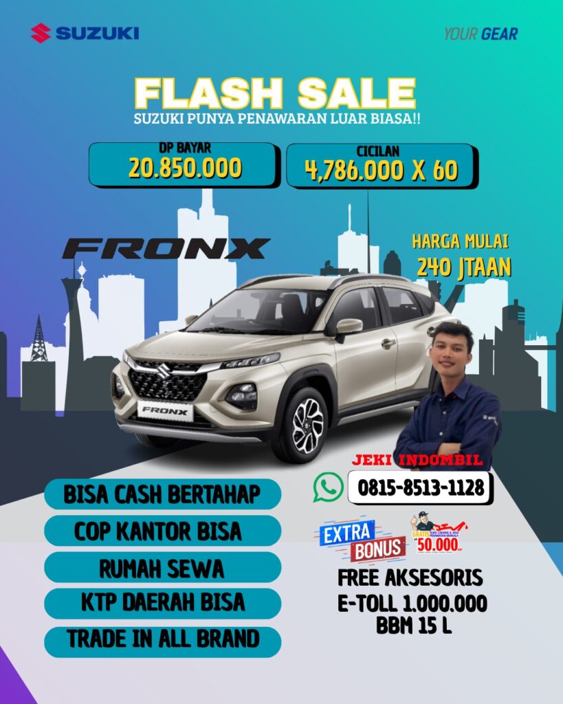 Suzuki Fronx hadir dengan desain modern bergaya SUV coupe, dilengkapi fitur canggih seperti Head-Up Display, kamera 360°, dan mesin Boosterjet yang efisien namun bertenaga. Cocok untuk kamu yang aktif, stylish, dan ingin tampil beda di setiap perjalanan.