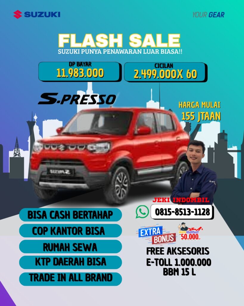 Suzuki S-Presso hadir sebagai city car bergaya SUV yang unik dan kompak, menawarkan posisi duduk tinggi, kabin lega, dan efisiensi bahan bakar yang luar biasa. Dilengkapi fitur fungsional seperti audio touchscreen, dual airbags, dan ABS, mobil ini cocok untuk kamu yang aktif, dinamis, dan butuh kendaraan lincah untuk mobilitas sehari-hari.